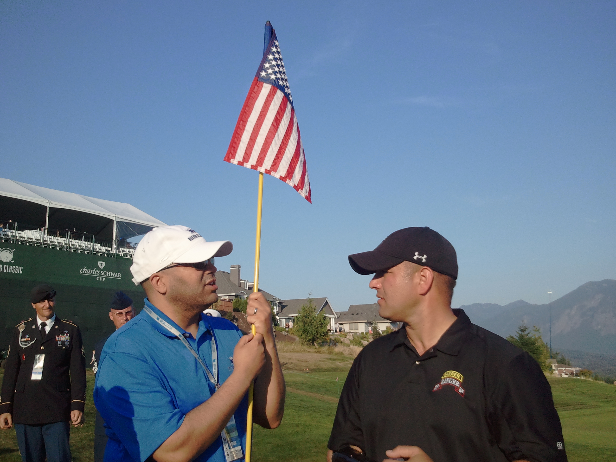 I saw Petry when the tournament leaders teed off but I didn’t get a chance to meet him until the end. While watching the last few groups finish up, one caddy pulled the flag/pin out of the 18th hole and set it on the ground. Now I know it is just a piece of fabric to most people, but it is what that piece fo fabric represents. It was all I could do not to rush onto the green, but I was working in a press capacity and my actions would not reflect on me alone. Fortunately, one of the military members walked over and secured the flag.