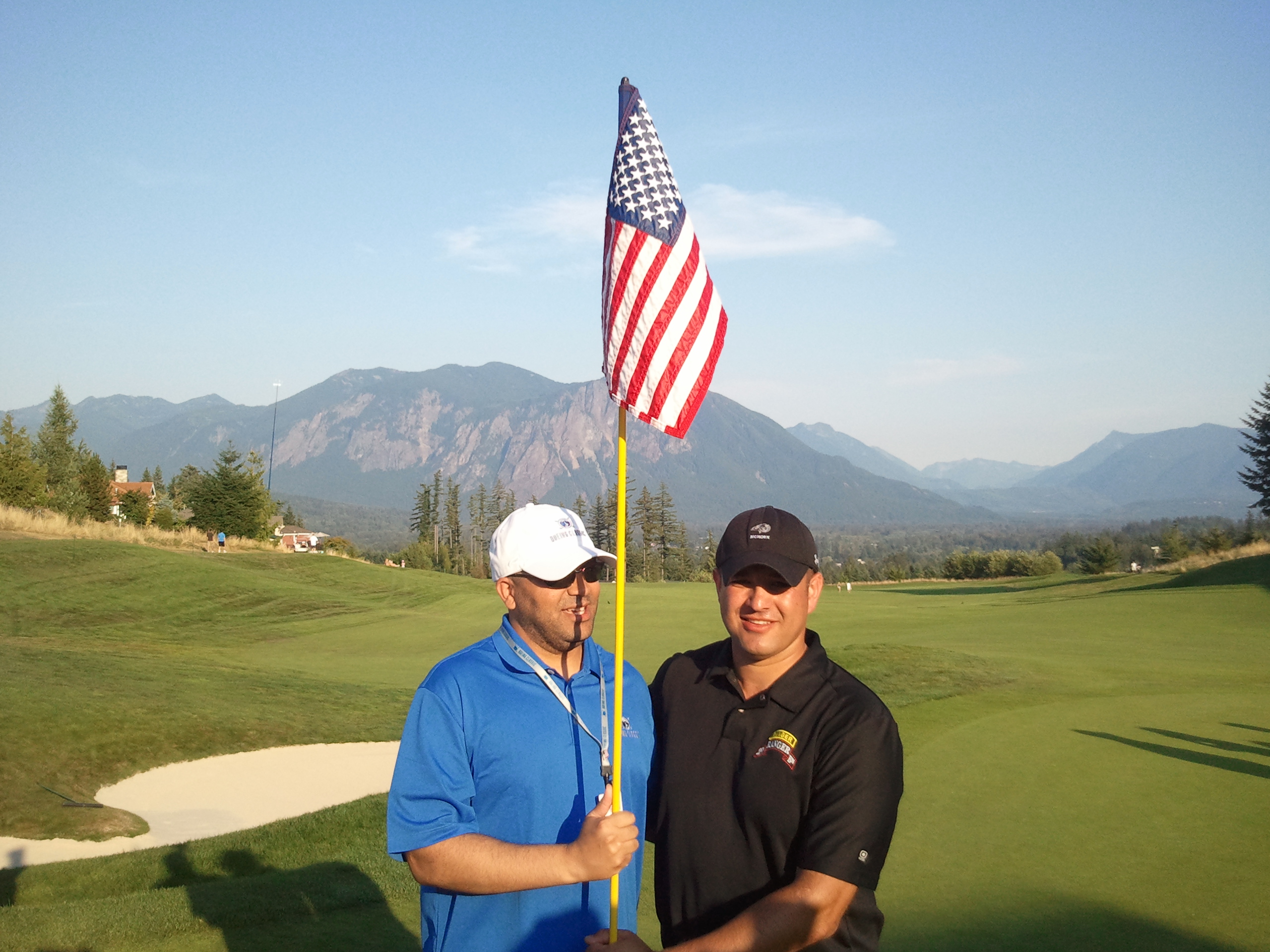 So there I was, on the 18th green, no shit. It was the last day of Rumble on the Ridge golf tournament. It was military appreciation day and the pin on the 18th hole was an American flag. As each group would finish, a military member in dress uniform would replace the flag. Each time, the crowd would cheer. It was pretty cool. Walking the course with the leaders was Medal of Honor (MOH) recipient Sergeant First Class (SFC) Leroy Petry.