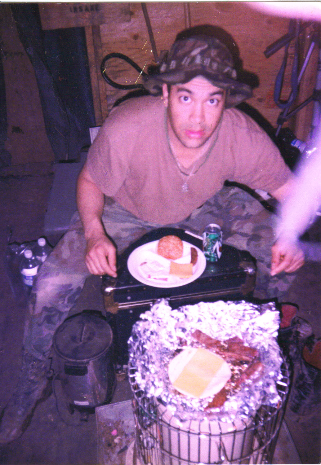 Sometimes we would raid the chow hall for ingredients to see what we could find. Personally I liked fajita night. We would slice up steak, heat up tortillas and throw on some cheese. I know that a kerosene heater covered in foil does not make the idea cooking surface, but we had to improvise.