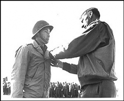 CPT Young Oak Kim being awarded Silver Star by General Mark Clark. His other medals include the Distinguished Service Cross, and other Silver Star, 2 Legion of Merit, 2 Bronze Stars, 3 Purple Hearts, Légion d’honneur, Croix de guerre (which was upgraded in 2005 to France’s highest military honor French Legion of Valor and Taeguk Cordon of the Order of Military Merit (Korea).